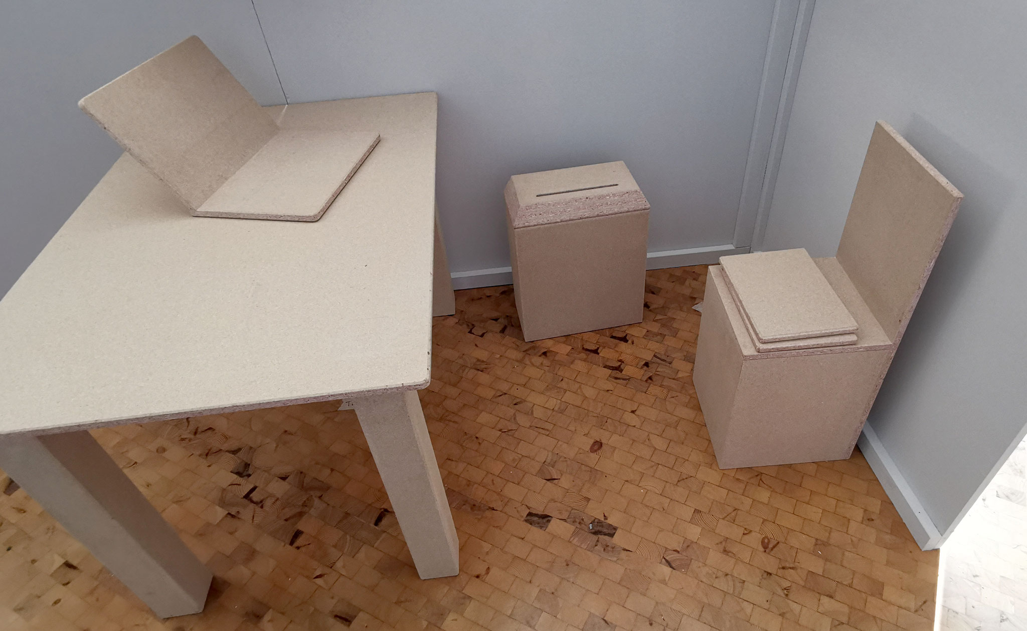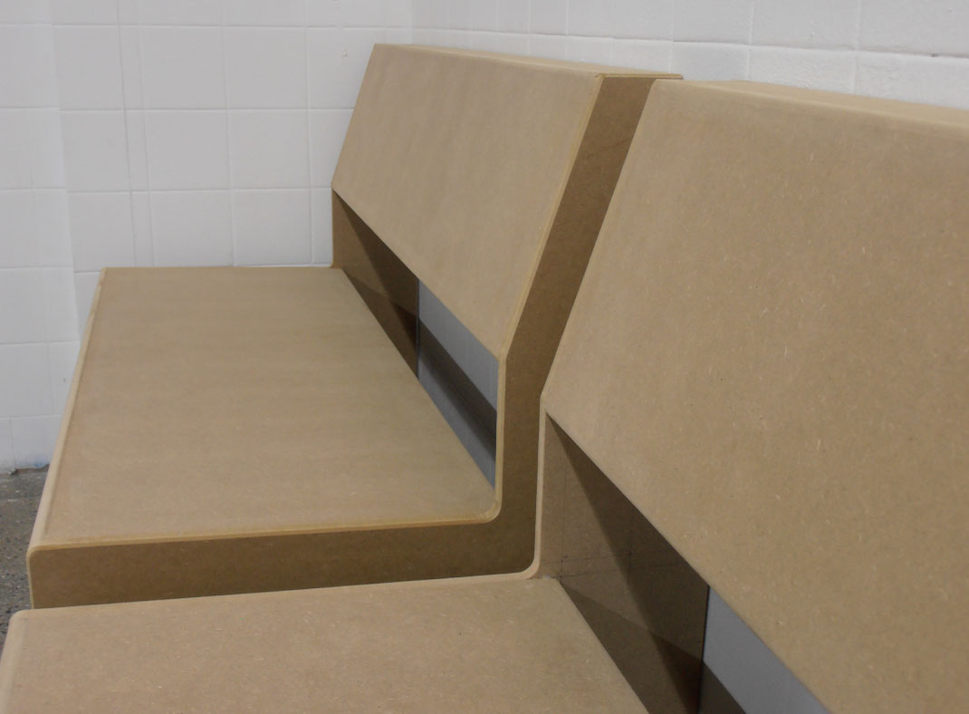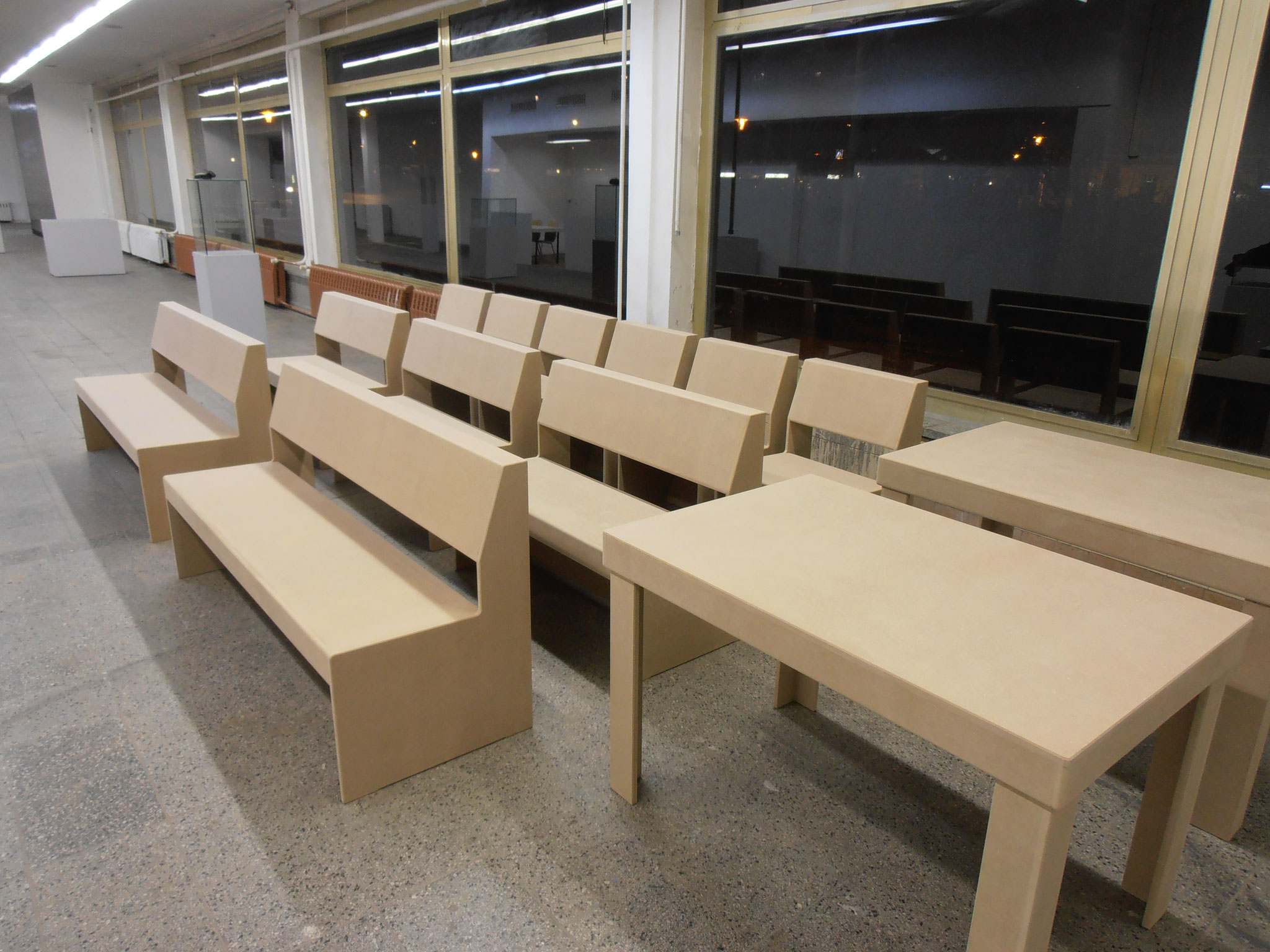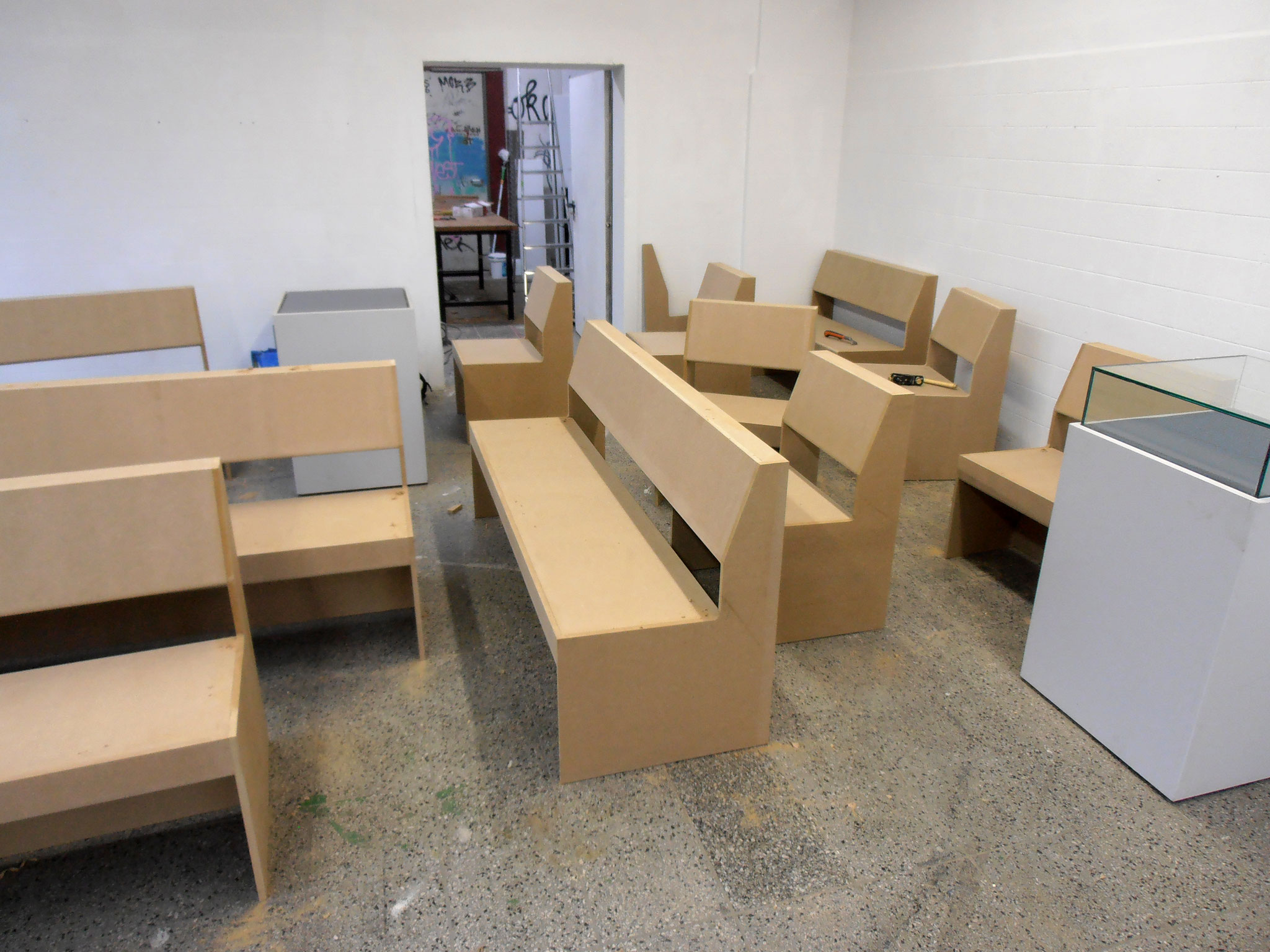 Die elf Sitzmöbel und zwei Tische wurden von mir für die Kunsthalle entworfen und vor Ort mit Handwerkzeugen gebaut.