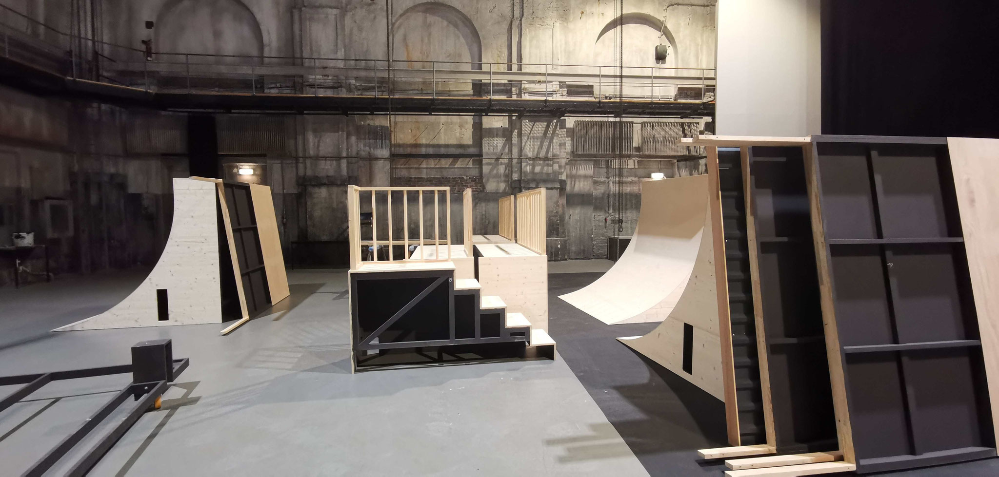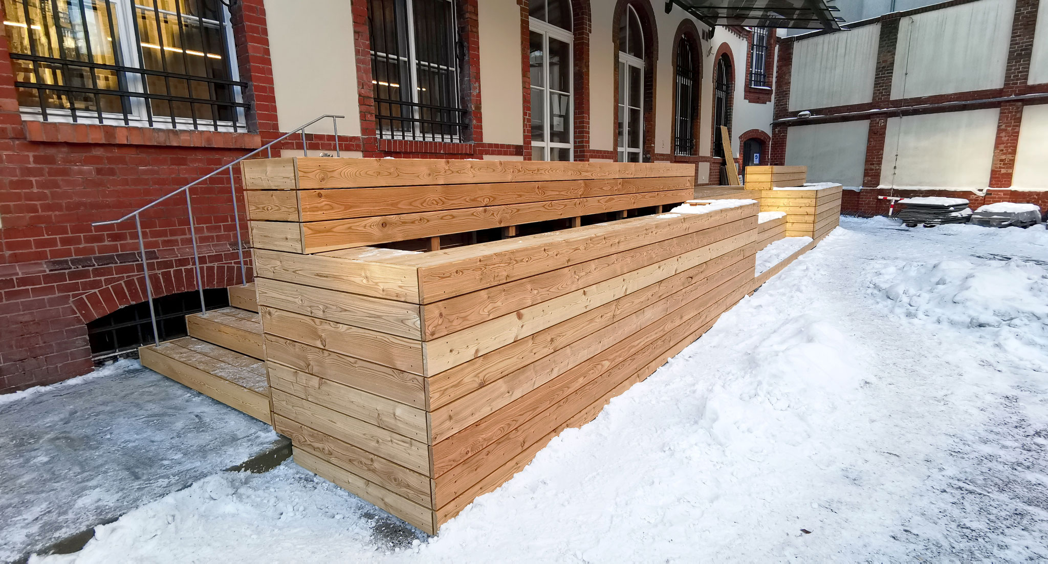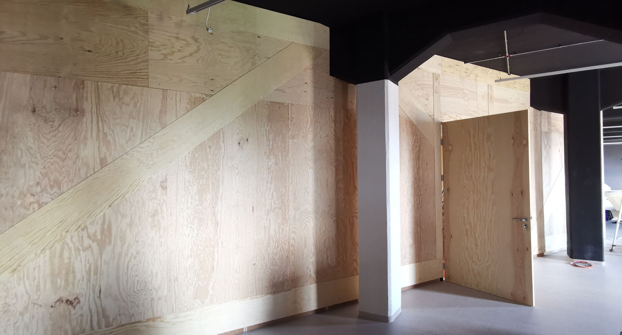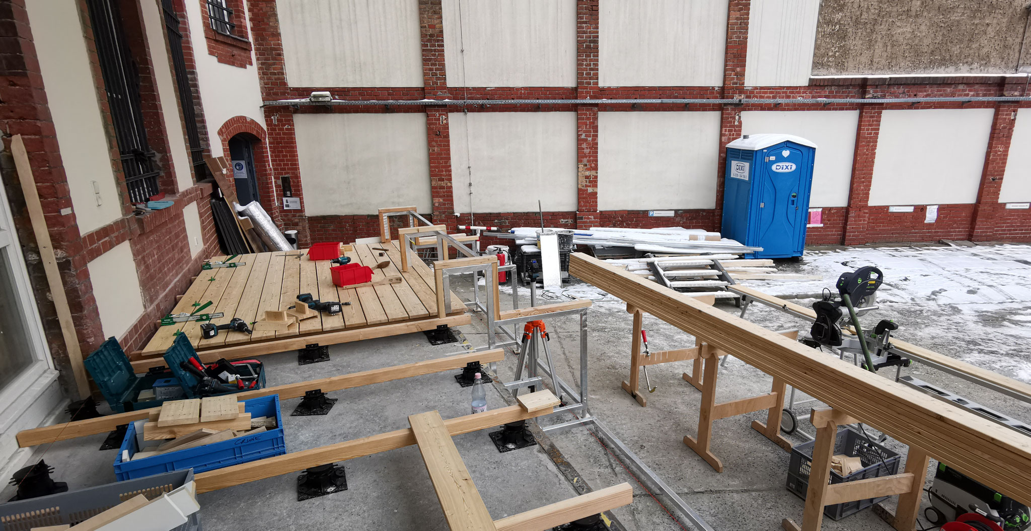 Die elf Sitzmöbel und zwei Tische wurden von mir für die Kunsthalle entworfen und vor Ort mit Handwerkzeugen gebaut.