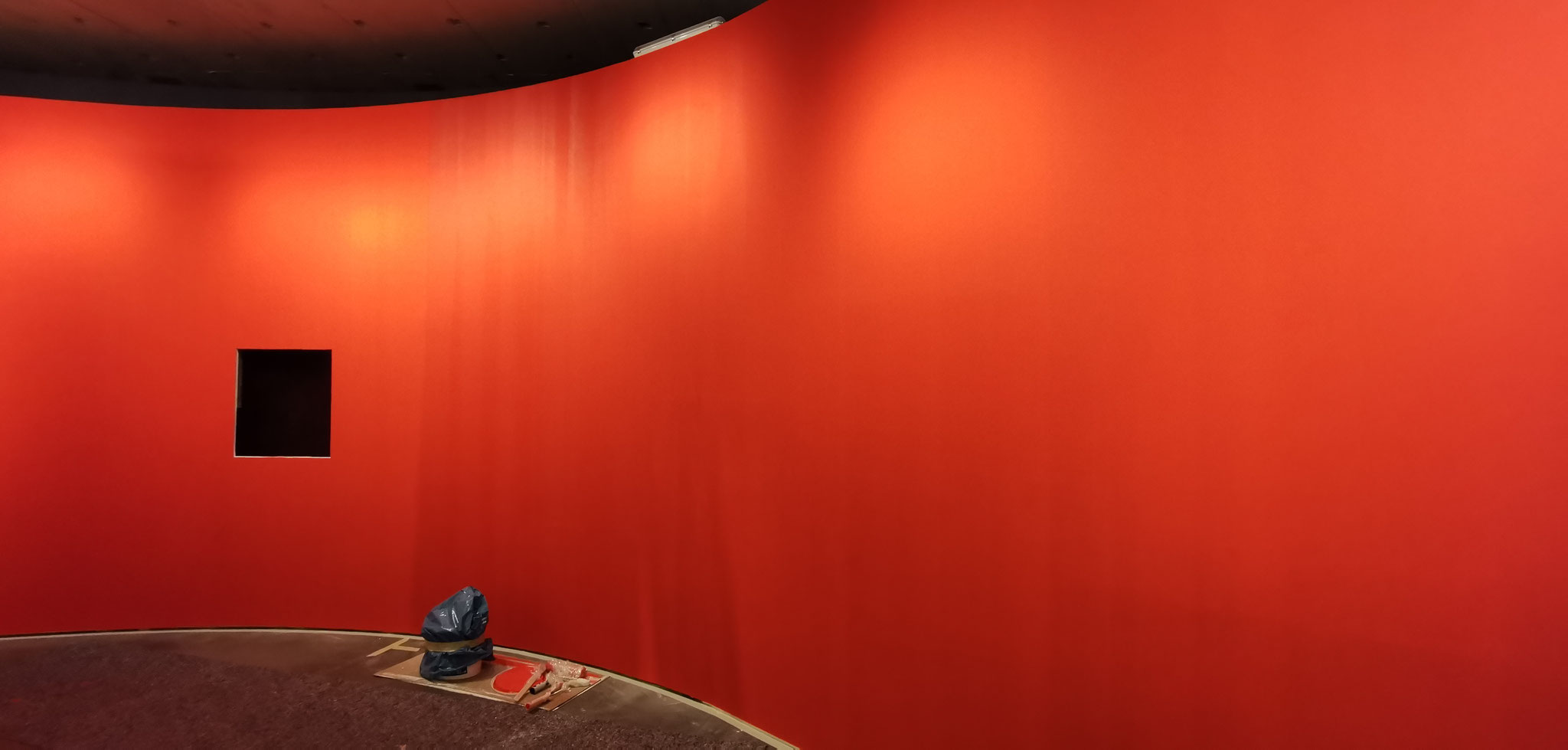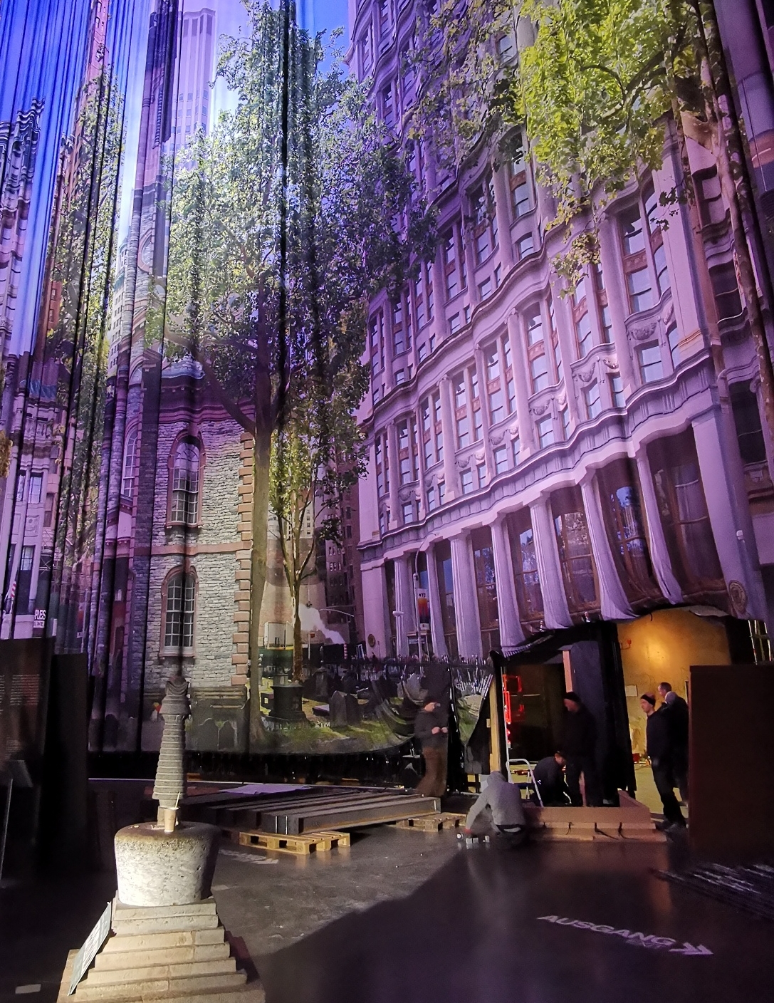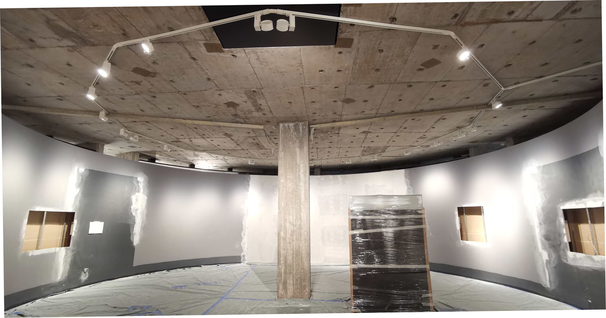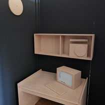 einem kreisrunden Vitrinenschrank mit Schubkästen und Türen, der persönliche Gebrauchsgegenstände zeigt und zugleich die gesamte Elektronik für die Ausstellung verbirgt. Die Umsetzung stellte